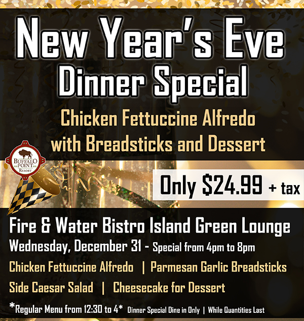 Buffalo Point Resort Centre 20 Buffalo Point Road, Buffalo Point, Manitoba, CanadaBistro Specials for December! Bacon Mushroom Burger Combo Upgrades extra Only $17.99 + tax December 17th to 27th Dine in Only Open Wednesday to Saturday – 12:30pm to 9pm Closed…